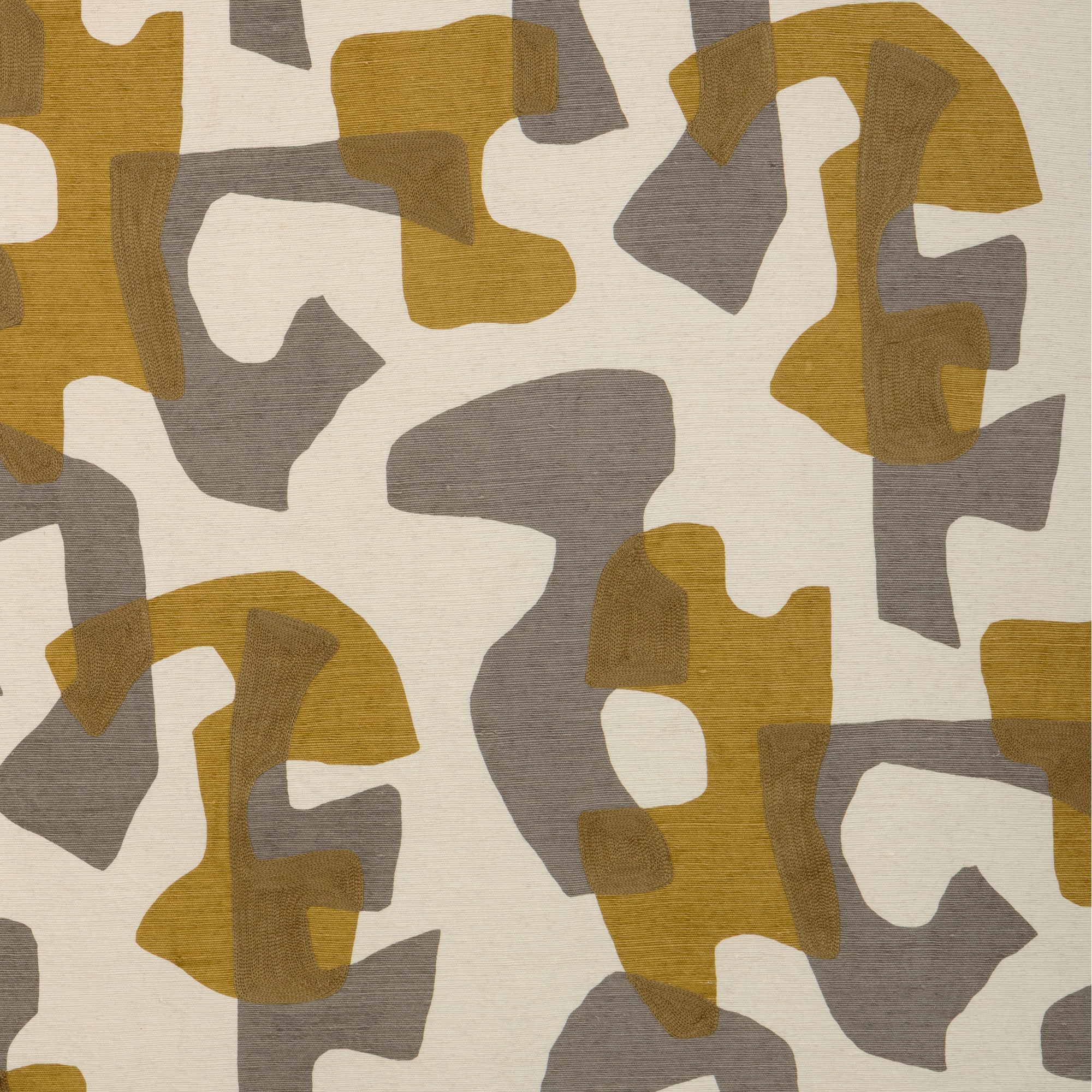 This embroidered textile starts with a beautiful, finely textured linen/cotton ground cloth. Two colors are then used to print and set the pattern, an engaging arrangement of abstract shapes. Lastly, hand placed chainstitch embroidery emphasizes every intersection of form and color. The result is a dynamic, multipurpose work of art that encourages the eye to linger.