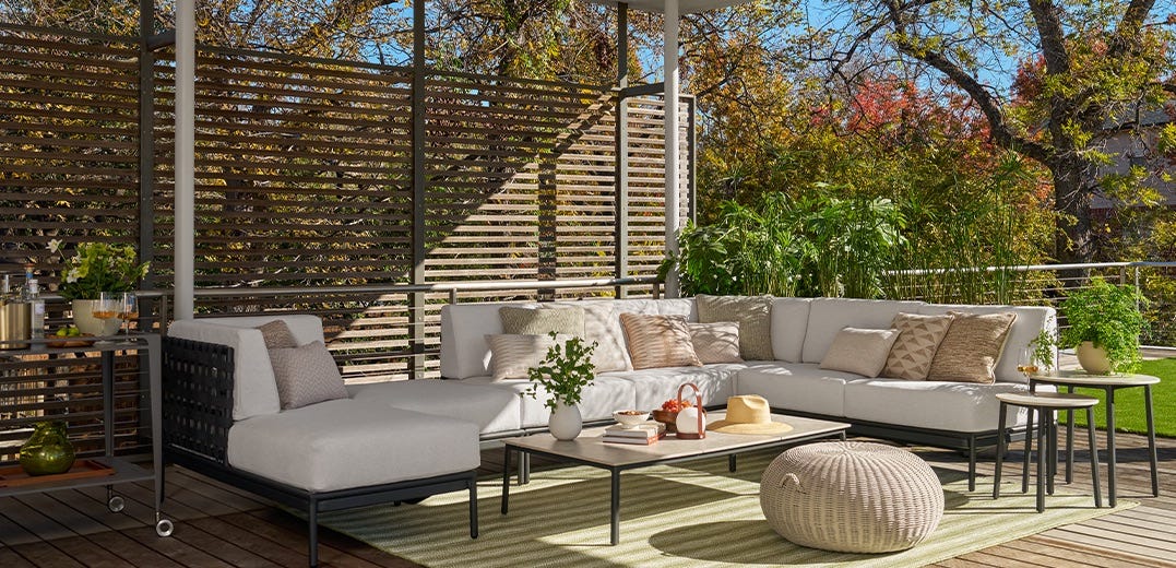 Designed to cover all aspects of outdoor living—from dining to lounging and entertaining—the collection features luxurious seating, dining and accent tables, and a range of accessories including poufs, fire tables, and umbrellas.