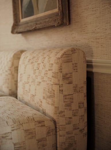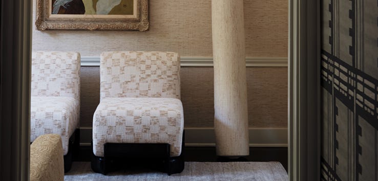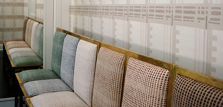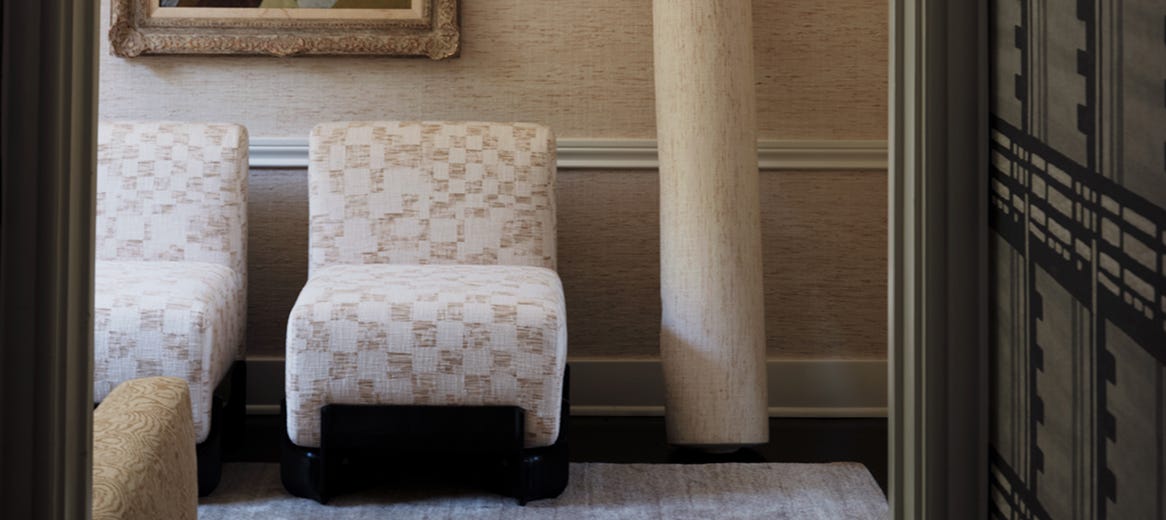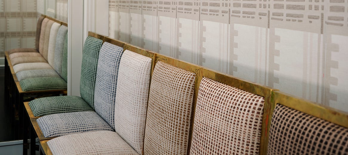 Inspired by urban architecture, the Transit textiles and Glyph wallcovering were designed to work together as a collaborative dual collection. The collections showcase the artisanal quality of Kelly Wearstler's designs through rhythmic patterns and structured forms. Glyph also introduces the first specialty textile wallcovering from her studio, while Transit focuses on intricate yarn quality and weave structure.