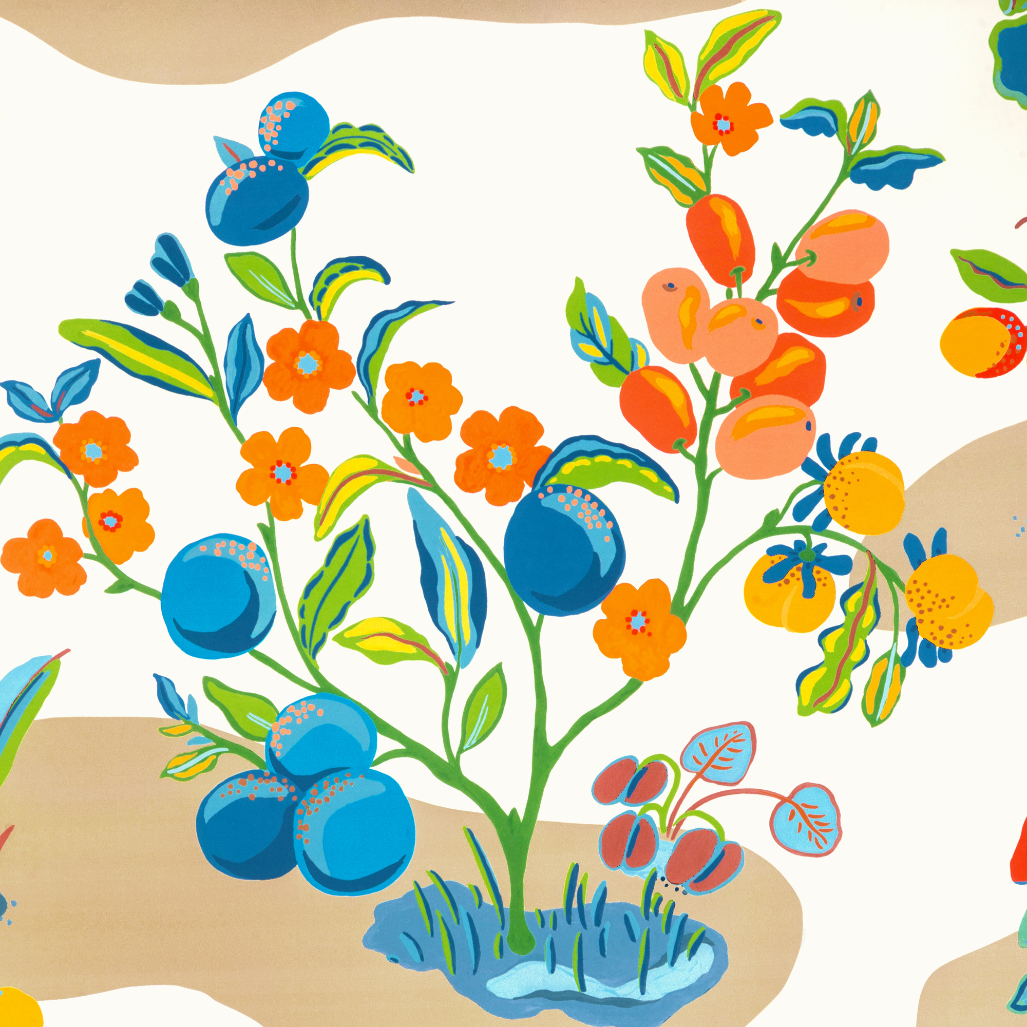 An original design graphically drawn and colorfully painted citrus trees comprise this enchanting fabric and wallpaper design. The linen/cotton blend fabric and complementary wallpaper are offered in four bold and happy colorways.