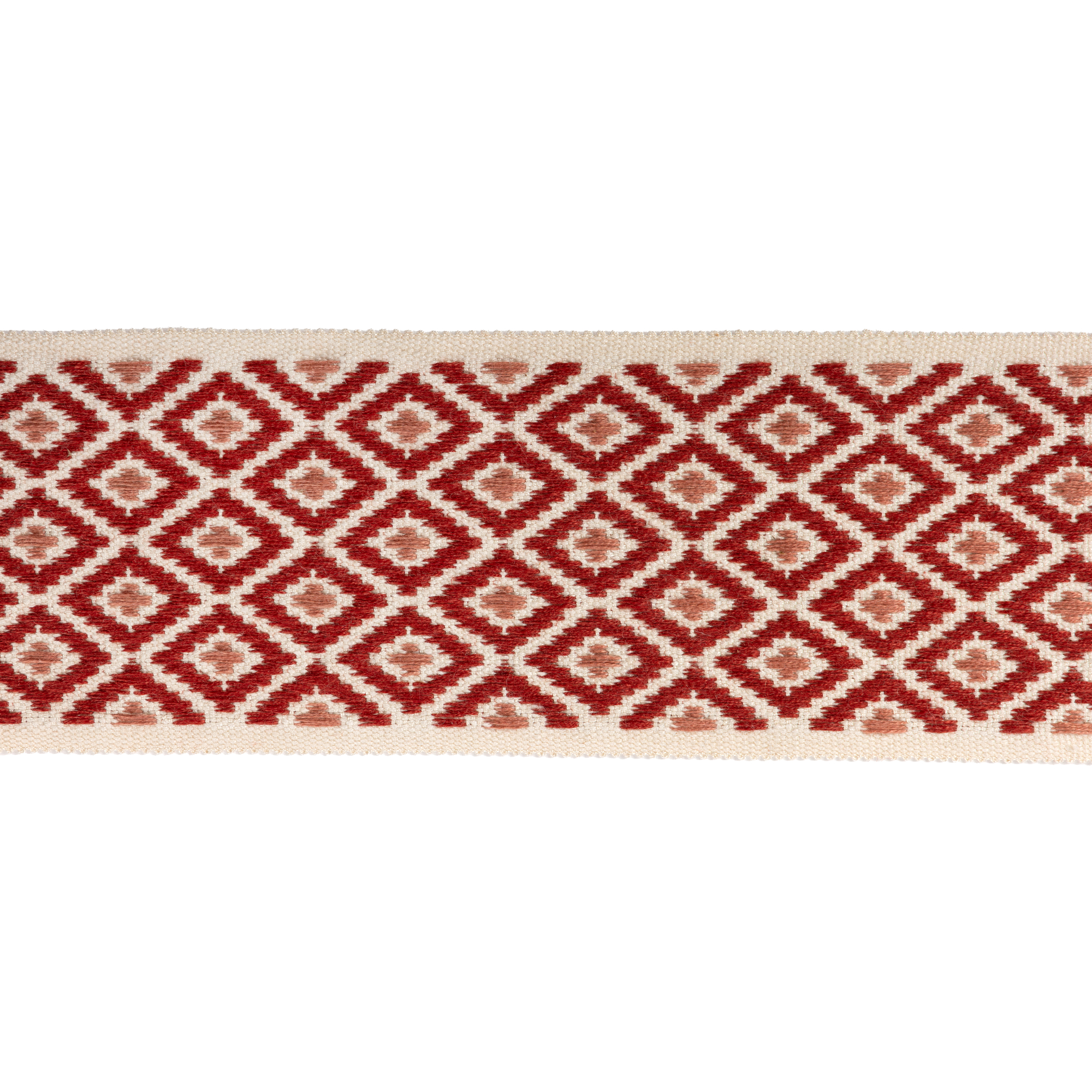 A classic pattern of concentric two-color diamonds is woven on a light ground to create the graphic effect of HENGRAVE TAPE. This easy-to-use linen blend trim is available in a range of sophisticated hues.